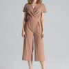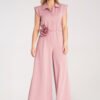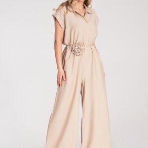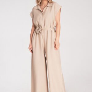 Kombinezon z szerokimi, długimi nogawkami i zapięciem na guziki z przodu. Góra z kołnierzykiem i krótkimi rękawami z podwinięciem. W talii cienki pasek z ozdobną kwiatową aplikacją. Luźny krój i lekki materiał zapewniają swobodę ruchu.