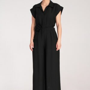 Kombinezon z szerokimi, długimi nogawkami i zapięciem na guziki z przodu. Góra z kołnierzykiem i krótkimi rękawami z podwinięciem. W talii cienki pasek z ozdobną kwiatową aplikacją. Luźny krój i lekki materiał zapewniają swobodę ruchu.