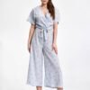 Letni kombinezon z krótkimi nogawkami, z kieszeniami, półokrągły dekolt, krótki rękaw, w pasie wszyta szeroka guma.
