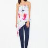 Letni kombinezon z krótkimi nogawkami, z kieszeniami, półokrągły dekolt, krótki rękaw, w pasie wszyta szeroka guma.