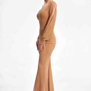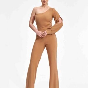 Elegancki, dopasowany kombinezon z jednym długim rękawem wykończony mankietem z ozdobnym rozcięciem. Dół z szerokimi nogawkami. Kombinezon bez kieszeni oraz bez zapięcia.