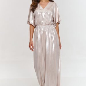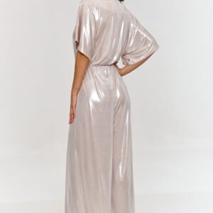 Ten kombinezon to połączenie elegancji i wygody, który z pewnością przyciągnie uwagę na każdej specjalnej okazji. Luźna góra z rękawami w stylu kimono dodają mu lekkości i swobody. Ten detal sprawia, że kreacja wygląda wyjątkowo i stylowo, jednocześnie nie ograniczając ruchów. Dekolt w serek jest subtelny i elegancki, doskonale eksponując szyję i ramiona. Taki krój dekoltu dodaje zmysłowości i podkreśla kobiecą sylwetkę, zachowując przy tym klasyczny, wytworny wygląd. Nogawki o szerokim kroju nadają kombinezonowi lekkości jednocześnie maskując niedoskonałości figury i pozwolą wydłużyć sylwetkę. Elastyczny pas w talii gwarantuje dopasowanie i podkreślenie figury, tworząc efekt wciętej talii. Dzięki temu kombinezon prezentuje się nie tylko stylowo, ale i komfortowo przez cały dzień czy wieczór. Model wykonany jest z delikatnego materiału o metalicznym wykończeniu, nadając stylizacji wyjątkowego blasku i nowoczesnego charakteru. Kombinezon w metalicznej barwie z dekoltem w serek to propozycja, która wyróżni Cię z tłumu. Jego nowoczesny krój i lśniący materiał sprawią, że poczujesz się pewnie i stylowo na każdym przyjęciu. Jest to doskonała alternatywa dla sukienki, gwarantująca wygodę oraz wyjątkowy wygląd.