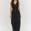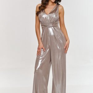 Przedstawiamy elegancki kombinezon, wykonany z metalicznego materiału dzięki któremu zyskujemy efektowny i nowoczesny wygląd. Głęboki dekolt w serek eksponuje ramiona i szyję, dodając stylizacji zmysłowości i elegancji natomiast wąskie ramiączka nadają całości uniwersalności. Góra jest dopasowana, odcięta w tali szerokim pasem, który doskonale podkreśla sylwetkę tworząc efekt smuklejszej figury. Natomiast szerokie, proste nogawki nadają mu lekkości i klasy stając się nowoczesnym wyborem, który przyciąga uwagę i pozwala poczuć się stylowo i pewnie. Dodatkowo z tyłu znajduje się delikatne wycięcie eksponujące plecy, wykończone zamkiem błyskawicznym ułatwiającym zakładanie. Nasz metaliczny kombinezon to doskonały wybór na wieczorne wyjścia, imprezy okolicznościowe oraz stylowe bankiety. Dzięki swojej nowoczesnej konstrukcji, zapewni Ci nie tylko komfort przez cały wieczór, ale również olśniewający wygląd, który przyciągnie wszystkie spojrzenia. Połącz go z eleganckimi szpilkami i biżuterią, aby stworzyć niepowtarzalną stylizację.