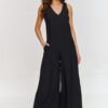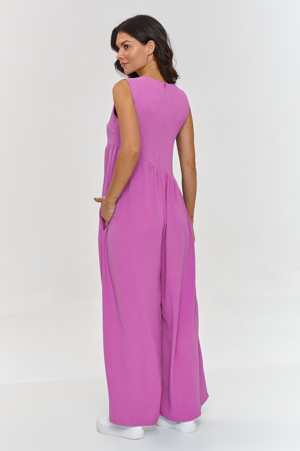 Ten kombinezon maxi to idealny wybór dla kobiet, które szukają wygodnego, a zarazem stylowego rozwiązania na ciepłe dni. Ma luźny krój, który zapewnia maximum wygody oraz na wysokości tali ukośne przeszycie tworzące delikatne fałdy. Szerokie nogawki dodają całości lekkości i elegancji, tworząc idealną opcję na codzienne stylizacje lub letnie wyjścia. Model wyposażony jest w kieszenie, co dodaje mu funkcjonalności i praktyczności. Kieszenie stanowią świetne rozwiązanie, gdy chcesz mieć pod ręką najpotrzebniejsze drobiazgi, nie rezygnując z eleganckiego wyglądu. Wykonany z przewiewnego materiału, który jest nie tylko przyjemny w dotyku, ale także praktyczny i przewiewny. Kombinezon posiada okrągły dekolt, który zapewnia wygodę i stylowy wygląd. Nasz kombinezon maxi z szerokimi nogawkami to doskonała opcja na każdą okazję, kiedy zależy Ci na modnym, ale zarazem wygodnym rozwiązaniu. Dzięki luźnemu krojowi, funkcjonalnym kieszeniom i lekkiemu materiałowi, kombinezon stanie się Twoim ulubionym wyborem na wiosenne i letnie dni, gwarantując zarówno wygodę, jak i styl.