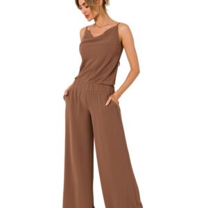 Kombinezon spodnium z drapowanym dekoltem i na cienkich ramiączkach wiązanych z tyłu. Kombinezon z gumą w pasie, po bokach kieszenie wsuwane.