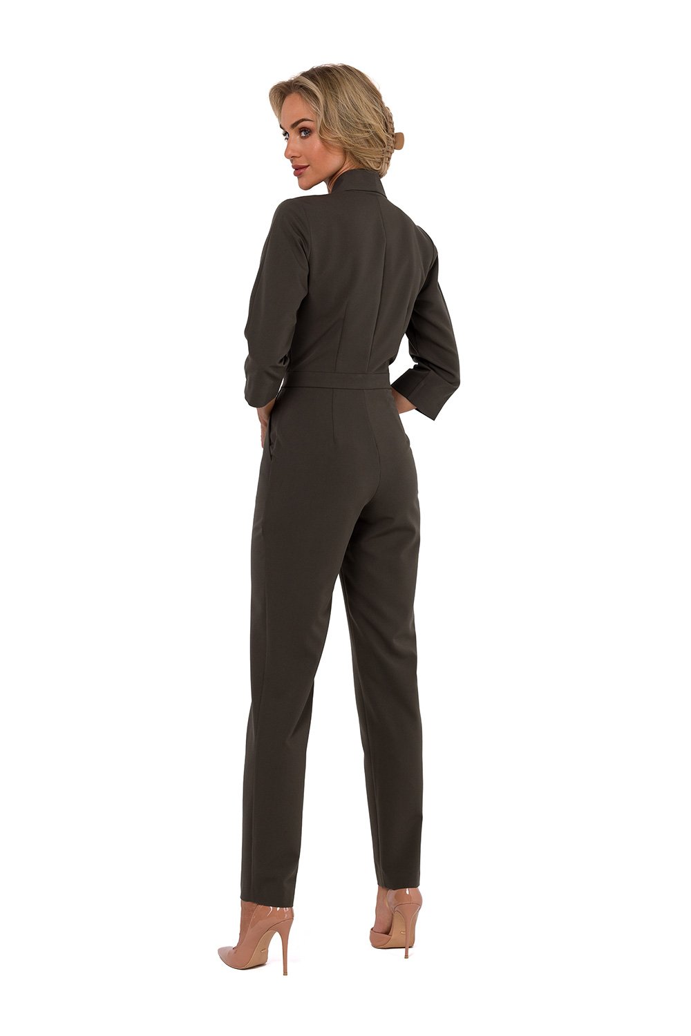 Kombinezon z rękawem 3/4 oraz wykładanym kołnierzem, zapinany na kryty zamek. Na linii talii miejscowe marszczenia, nogawki wąskie z przeszyciem przez środek. Zaprojektowany i uszyty w Polsce.