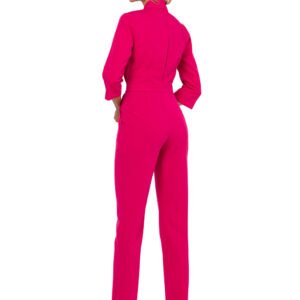 Kombinezon z rękawem 3/4 oraz wykładanym kołnierzem, zapinany na kryty zamek. Na linii talii miejscowe marszczenia, nogawki wąskie z przeszyciem przez środek. Zaprojektowany i uszyty w Polsce.