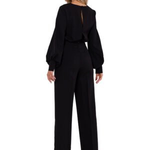 Kombinezon z długim bufiastym rękawem oraz okrągłym dekoltem. Kombinezon zapinany na kryty zamek i guziki. Nogawki kombinezonu z kantem poszerzane ku dołowi. Kombinezon bez podszewki. Zaprojektowany i uszyty w Polsce.