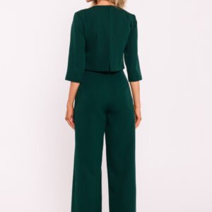 Elegancki kombinezon damski wykonany z wysokiej jakości tkaniny. Charakteryzuje się szerokimi nogawkami, które nadają mu modny, swobodny wygląd. Góra kombinezonu jest podwójna, co dodaje mu struktury i elegancji, a krótkie rękawy zapewniają komfort w cieplejsze dni. Z tyłu znajduje się kryty zamek, który ułatwia zakładanie i zdejmowanie. Boczne kieszenie wsuwane dodają praktyczności i funkcjonalności. Zaprojektowany i uszyty w Polsce, łączy nowoczesny styl z doskonałym rzemiosłem.