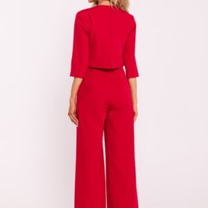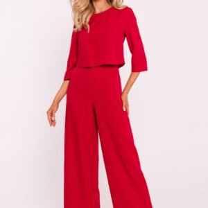 Elegancki kombinezon damski wykonany z wysokiej jakości tkaniny. Charakteryzuje się szerokimi nogawkami, które nadają mu modny, swobodny wygląd. Góra kombinezonu jest podwójna, co dodaje mu struktury i elegancji, a krótkie rękawy zapewniają komfort w cieplejsze dni. Z tyłu znajduje się kryty zamek, który ułatwia zakładanie i zdejmowanie. Boczne kieszenie wsuwane dodają praktyczności i funkcjonalności. Zaprojektowany i uszyty w Polsce, łączy nowoczesny styl z doskonałym rzemiosłem.