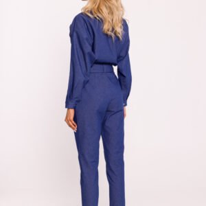 Elegancki kombinezon damski wykonany z tkaniny bawełnianej, idealny na co dzień i na specjalne okazje. Góra na zakładkę z kołnierzem dodaje szyku, a zapinanie na rozporek, napę oraz kryty guzik zapewnia wygodę i bezpieczeństwo noszenia. Długie rękawy zapinane na zatrzask oraz zwężane nogawki podkreślają sylwetkę. Boczne kieszenie dodają praktyczności, a pasek zapinany na zatrzaski z możliwością regulacji pozwala na idealne dopasowanie do talii. Zaprojektowany i uszyty w Polsce, ten kombinezon łączy w sobie styl, komfort i funkcjonalność.