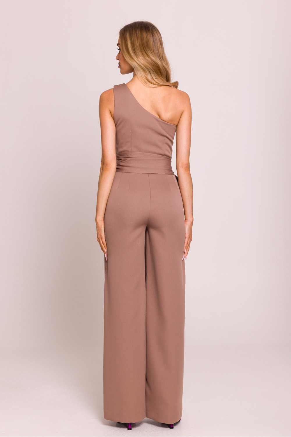 Elegancki, asymetryczny kombinezon z motywem na jedno ramię, który przyciąga wzrok swoją wyjątkową formą. Długie szarfy wszyte do boków nadają mu lekkości i efektownego charakteru, pozwalając na ciekawe stylizowanie. Lekko poszerzone nogawki zapewniają komfort i elegancki wygląd. Model zapinany na kryty zamek z boku, co gwarantuje idealne dopasowanie. Całość zaprojektowana i uszyta w Polsce z najwyższą dbałością o detale, łącząc nowoczesność z klasyką.
