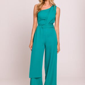 Elegancki, asymetryczny kombinezon z motywem na jedno ramię, który przyciąga wzrok swoją wyjątkową formą. Długie szarfy wszyte do boków nadają mu lekkości i efektownego charakteru, pozwalając na ciekawe stylizowanie. Lekko poszerzone nogawki zapewniają komfort i elegancki wygląd. Model zapinany na kryty zamek z boku, co gwarantuje idealne dopasowanie. Całość zaprojektowana i uszyta w Polsce z najwyższą dbałością o detale, łącząc nowoczesność z klasyką.