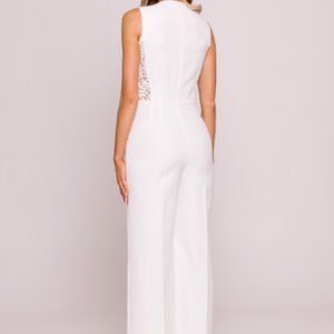 Wyjątkowy kombinezon, który łączy w sobie klasyczną elegancję i subtelną zmysłowość. Wykonany z gładkiej, przyjemnej w dotyku tkaniny, wzbogacony po bokach o geometryczne, koronkowe panele, które pięknie modelują sylwetkę i dodają całości lekkości. Dopasowana góra z zabudowanym, okrągłym dekoltem i bez rękawów kontrastuje z szerokimi, długimi nogawkami zaprasowanymi na kant, tworząc elegancki, wydłużający optycznie nogi fason. Talia została podkreślona metalową ozdobą z przodu, która stanowi minimalistyczny, ale efektowny detal. Z tyłu kryty zamek zapewnia wygodne zakładanie, a brak kieszeni podkreśla czystość formy. Kombinezon doskonale sprawdzi się podczas uroczystości, wieczornych wyjść czy formalnych spotkań. Zaprojektowano i uszyto w Polsce, z dbałością o jakość i detale. Koronka 90% nylon, 10% spandex.