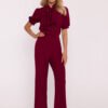 Kombinezon zamiast sukienki? Tak! Zawsze wtedy gdy potrzebujesz wyglądać wyjątkowo i czuć się komfortowo. Taki kombinezon, uszyty z lekko połyskującej tkaniny, z luźną, zbluzowaną górą bez rękawów ale z poduszkami na ramionach i spodniami z lekko zwężonymi do dołu nogawkami, a w talii zebrany paskiem z klamrą to sztos! Kombinezon zapinany na kryty zamek.