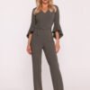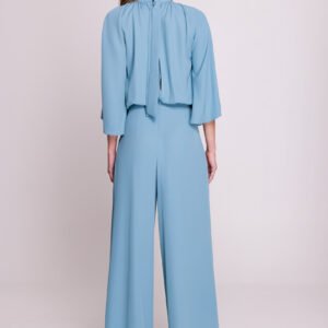 Elegancki i wyrafinowany kombinezon, który łączy styl i wygodę w perfekcyjnej harmonii. Góra delikatnie marszczona, z szerokimi kimonowymi rękawami, nadaje mu lekkości i subtelnej objętości. Dekolt ze stójką wiązaną z tyłu długimi szarfami pozwala na regulację dopasowania, a rozcięcie na plecach można dowolnie otwierać lub zamykać, dostosowując je do własnych preferencji. Szerokie, luźno opadające nogawki dodają elegancji i swobody ruchu, a boczne kieszenie zapewniają funkcjonalność. Model zapinany na kryty zamek z tyłu, co podkreśla jego estetyczne wykończenie. Zaprojektowany i uszyty w Polsce, z najwyższą dbałością o detale. Idealny na wyjątkowe okazje i stylowe wyjścia. Długość w tabelce dotyczy długości nogawki.
