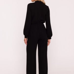 Elegancki, klasyczny kombinezon wykonany z gładkiej tkaniny o miękkim wykończeniu. Góra dopasowana, ozdobiona subtelnym żabotem, wykończona stójką pod szyję. Długie, lekko bufiaste rękawy zakończone są mankietami zapinanymi na ozdobne guziki, co dodaje całości wyrafinowanego charakteru. Talia została wyraźnie zaakcentowana, co podkreśla sylwetkę i harmonijnie przechodzi w luźniejsze, proste nogawki zaprasowane na kant. Na plecach kryty zamek zapewnia komfort noszenia i estetyczne wykończenie. Model łączy w sobie ponadczasową klasykę z nowoczesnym detalem, idealny zarówno na eleganckie wyjścia, jak i formalne okazje. Zaprojektowano i uszyto w Polsce.