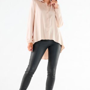 Elegancka koszula z długim rękawem oraz przedłużonym tyłem. Mankiety zakończone gumką dodają koszuli luźnego charakteru. Luźny krój koszuli pozwala na zamaskowanie delikatnych niedoskonałości. W połączeniu ze spodniami z imitacji skóry można stworzyć stylizację na styl miejski. Produkt zaprojektowany i uszyty w Polsce.
