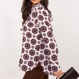 Elegancka koszula damska o klasycznym kroju, idealna do codziennych stylizacji oraz do pracy. Model o standardowej długości z delikatnie wydłużonym tyłem prezentuje się nowocześnie i doskonale układa się na sylwetce, zapewniając komfort noszenia przez cały dzień. Koszula wykonana jest z połączenia poliestru i elastanu, dzięki czemu jest elastyczna, trwała i odporna na zagniecenia. Kolorowy nadruk nadaje jej wyrazistego, stylowego charakteru, który ożywia elegancką formę i pozwala wyróżnić się w biurowych oraz codziennych zestawach. Klasyczny kołnierzyk oraz zapięcie na guziki kryte listwą podkreślają schludny, elegancki wygląd koszuli. Długi rękaw sprawia, że model świetnie sprawdzi się przez cały rok. To uniwersalna propozycja, która doskonale komponuje się zarówno z eleganckimi spodniami i spódnicą, jak i z jeansami.