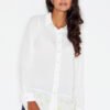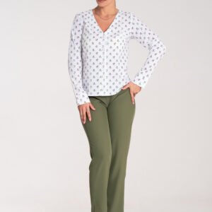 Koszula o dopasowanym kroju z długim rękawem, bez kołnierzyka. Koszula posiada dekolt w serek, jest zapinana na napy.