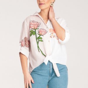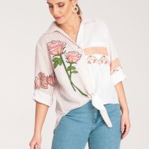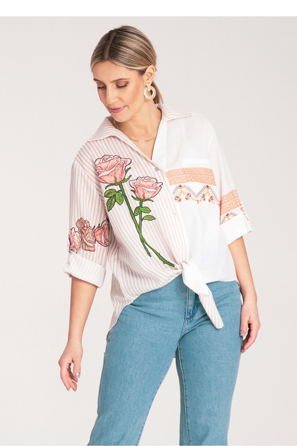 Koszula damska o asymetrycznym wzorze, łączącym paski z haftowanymi motywami kwiatowymi i etnicznymi. Model z klasycznym kołnierzem, kieszonką na piersi i wiązaniem u dołu. Styl luźny dostosowany do wielu rodzajów sylwetki.