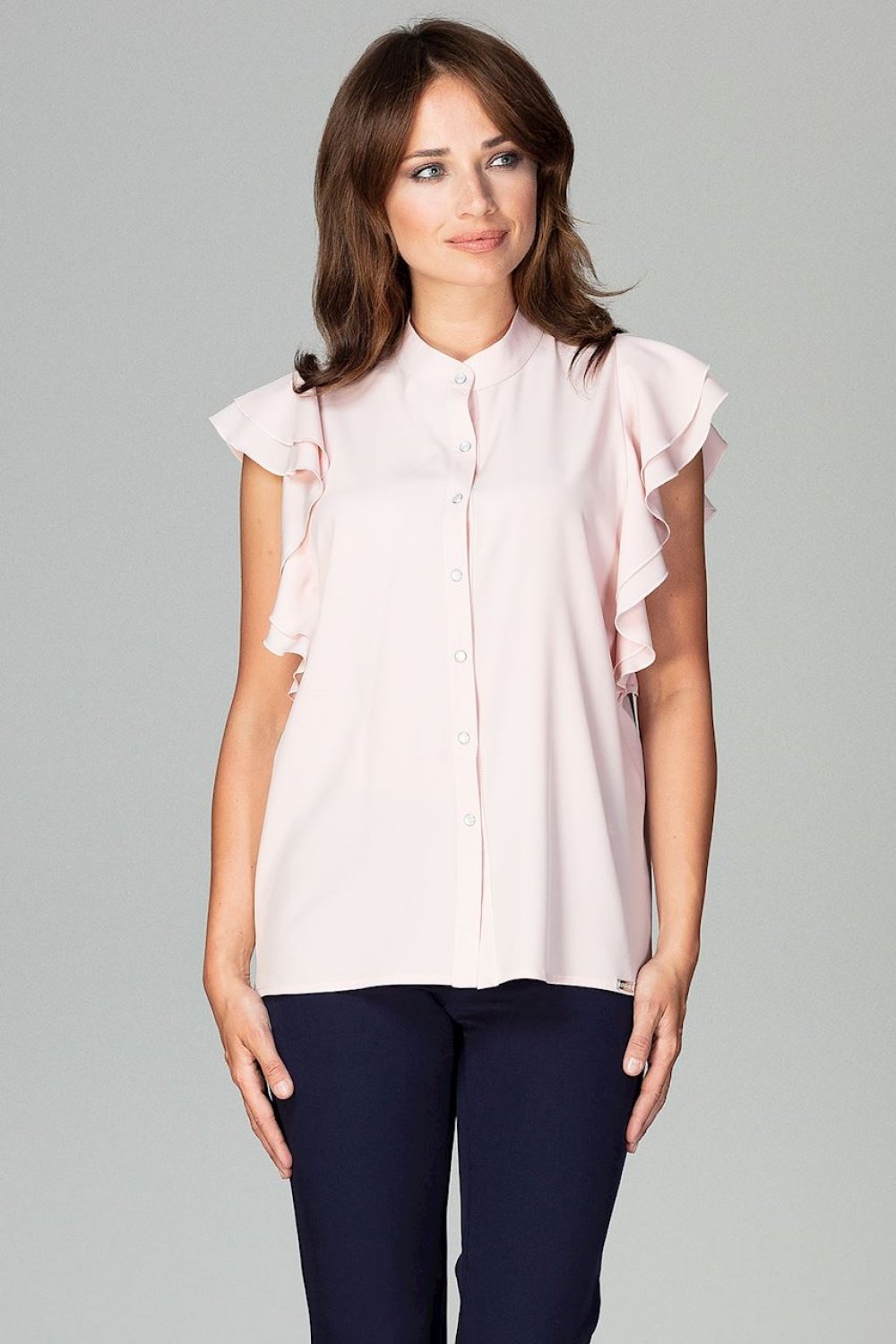 Ponadczasowa klasyka w najlepszym wydaniu. Model ma luźny krój, rękawki wykończone są falbankami, zapinana na ozdobne napy. Koszula powinna się znaleźć w garderobie każdej, aktywnej zawodowo kobiety.