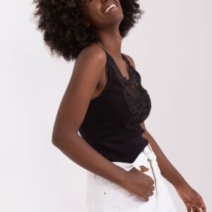 Koszulka na ramiączkach z prążkowanego materiału z okrągłym dekoltem. Dekolt ozdobiony naszytą koronką.