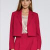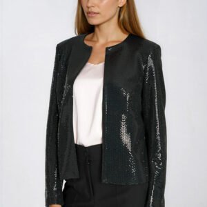 Stylowy żakiet o kroju regular, który łączy elegancję z wyrazistym charakterem. Wykonany z efektownego materiału klejonego z cekinami, przyciąga uwagę subtelnym blaskiem i doskonale sprawdzi się w wieczorowych stylizacjach. Model bez zapięcia prezentuje się lekko i nowocześnie, idealnie dopełniając zarówno sukienki, jak i zestawy ze spodniami. Poduszki na ramionach podkreślają linię sylwetki i nadają całości modnych proporcji. Żakiet posiada podszewkę, która zapewnia komfort noszenia oraz estetyczne wykończenie. Doskonały wybór na wyjątkowe okazje i eleganckie wyjścia.