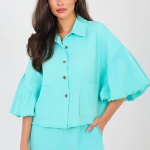 Stylowa damska kurtka jeansowa w casualowym wydaniu, idealna na wiosnę i lato. Wykonana z wysokiej jakości bawełny, zapewnia komfort noszenia na co dzień. Krótki fason pięknie podkreśla sylwetkę, a dół oraz rękawy wykończone modnym wystrzępieniem dodają całości lekkości i charakteru. Model zapinany jest na guziki, z przodu posiada praktyczne naszyte kieszenie. Rękawy 3/4 z falbaną wprowadzają subtelny, kobiecy akcent, który świetnie przełamuje klasyczny jeansowy styl. Kurtka jest bez ocieplenia, dzięki czemu doskonale sprawdzi się w cieplejsze dni. To uniwersalna propozycja do codziennych stylizacji, idealna zarówno do sukienek, jak i jeansów czy spódnic.
