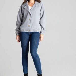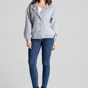 Szara krótka kurtka z opadającym rękawem zapinana na ozdobne guziki. Kurtka o luźnym kroju z podszewką, w bocznych szwach kieszenie. W rękawach oraz na dole kurtki wszyta gumka.