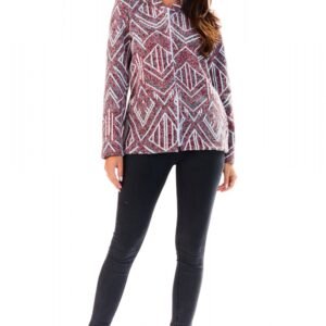 Prosta kurtka w ciekawy wzór w odcieniu bordo. Kurtka zapinana na zamek. Po bokach kieszenie wsuwane. Kurtka posiada kaptur.