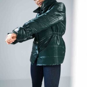 Błyszcząca pikowana kurtka do bioder z wysoką stójką. W pasie i w rękawach marszczona gumą. Zapinana na napy, kieszenie wsuwane, ocieplana z podszewką.