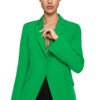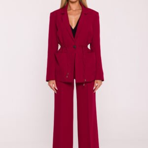 Stylowa marynarka damska uszyta z gładkiej tkaniny o matowym wykończeniu to połączenie klasyki z nowoczesną funkcjonalnością. Luźny fason typu oversize zapewnia swobodę ruchu, a regulacja w talii troczkami z metalowymi końcówkami pozwala dopasować marynarkę do sylwetki, podkreślając kobiece wcięcie. Model posiada klasyczny kołnierz z klapami oraz pojedyncze zapięcie na guzik, które w połączeniu z trokami tworzy eleganckie i jednocześnie nowoczesne wykończenie. Długie rękawy bez mankietów oraz duże naszywane kieszenie dodają praktyczności i subtelnego, casualowego charakteru. Marynarka jest w całości podszewkowana, co gwarantuje komfort noszenia i perfekcyjne ułożenie materiału. Fason o prostym kroju, z możliwością regulacji w pasie, sprawia, że marynarka świetnie komponuje się zarówno z eleganckimi, jak i codziennymi stylizacjami. Zaprojektowana i uszyta w Polsce, stworzona dla kobiet, które cenią wygodę, styl i nowoczesne detale w klasycznym wydaniu.