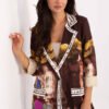 Marynarka o prostym kroju, z kolorowego materiału na podszewce. Na ramionach wszyte poduszki. Marynarka z długim rękawem, zapinana na guzik. Po bokach imitacja kieszeni.