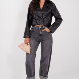 Stylowa marynarka damska wykonana z wysokiej jakości eko skóry na bazie wiskozy i poliuretanu, idealna do codziennych stylizacji oraz do pracy. Casualowy charakter modelu sprawia, że doskonale łączy elegancję z nowoczesnym, miejskim stylem. Gładki materiał podkreśla uniwersalność marynarki i nadaje jej ponadczasowego wyglądu. Model o krótkiej długości, z długim rękawem oraz wykładanymi klapami, zapinany na guziki w dwurzędowym układzie. Wszyte poduszki na ramionach subtelnie podkreślają linię barków i nadają sylwetce wyrazistej formy. Marynarka posiada podszewkę, co zwiększa komfort noszenia. Brak ocieplenia i wypełnienia sprawia, że jest to idealny wybór na sezon jesień, zimę oraz wiosnę zarówno do biura, jak i na co dzień.