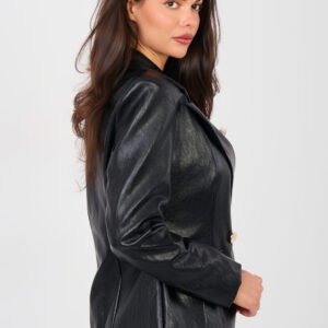 Stylowa marynarka damska z eko skóry to nowoczesna propozycja do codziennych stylizacji oraz do pracy. Wykonana z wysokiej jakości materiału będącego połączeniem wiskozy i poliuretanu, prezentuje się elegancko, a jednocześnie zapewnia komfort noszenia. Model o standardowej długości z długim rękawem oraz klasycznymi, wykładanymi klapami podkreśla ponadczasowy charakter fasonu. Gładki wzór nadaje marynarce uniwersalnego wyglądu, dzięki czemu łatwo dopasować ją do wielu zestawów. Dwurzędowe zapięcie na guziki stanowi stylowy akcent i dodaje całości elegancji. Dodatkowym atutem jest podszewka, która zwiększa wygodę użytkowania i estetykę wykończenia. Marynarka doskonale komponuje się zarówno ze spodniami, jak i spódnicą czy sukienką, tworząc modne i spójne stylizacje.