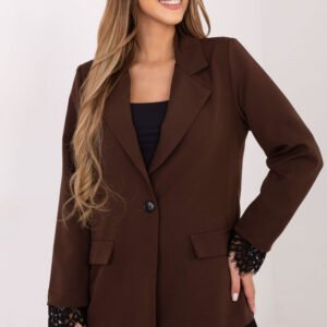 Elegancka marynarka damska to uniwersalny element garderoby, który doskonale sprawdzi się zarówno na co dzień, do pracy, jak i na okazje wizytowe czy imprezowe. Klasyczny krój o standardowej długości podkreśla sylwetkę i nadaje stylizacji szyku. Model wyposażony jest w wykładane klapy oraz wszyte poduszki na ramionach, które nadają marynarce wyrazistej formy i optycznie modelują linię ramion. Jednorzędowe zapięcie na guzik podkreśla elegancki charakter całości, a gładki wzór sprawia, że marynarka jest ponadczasowa i łatwa do stylizowania. Wyjątkowym akcentem są koronkowe wykończenia, zarówno u dołu marynarki, jak i przy długich rękawach, które dodają całości kobiecej lekkości i subtelnej elegancji. Wykonana z połączenia poliestru i elastanu, zapewnia komfort noszenia oraz dobre dopasowanie. Podszewka zwiększa wygodę i sprawia, że marynarka doskonale układa się na sylwetce. To idealna propozycja dla kobiet, które szukają eleganckiej marynarki z delikatnym, dekoracyjnym akcentem, pasującej na wiele różnych okazji.