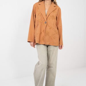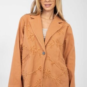 Casualowa marynarka damska wykonana z wysokiej jakości bawełny, idealna do codziennych stylizacji. Jeansowy materiał nadaje jej swobodnego charakteru, a jednocześnie sprawia, że model jest ponadczasowy i uniwersalny. Marynarka o standardowej długości, z długim rękawem oraz klasycznymi, wykładanymi klapami. Wyjątkowym akcentem są wyszywane kwiaty umieszczone na przodzie, które dodają całości kobiecego i oryginalnego wyglądu. Model zapinany na guzik, wyposażony w praktyczne kieszenie, łączy estetykę z funkcjonalnością. Doskonały wybór na co dzień, świetnie sprawdzi się zarówno w połączeniu z jeansami, jak i sukienką czy spódnicą.