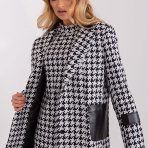Marynarka damska z długim rękawem oraz wykładanym kołnierzem. Marynarka zapinany na guziki, posiada podszewkę. Marynarka z kieszeniami wsuwanymi. Marynarka wykonana z materiału w pepitkę z wykończeniami z eko skóry.