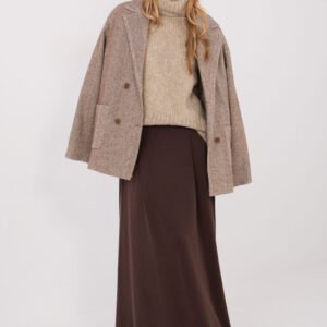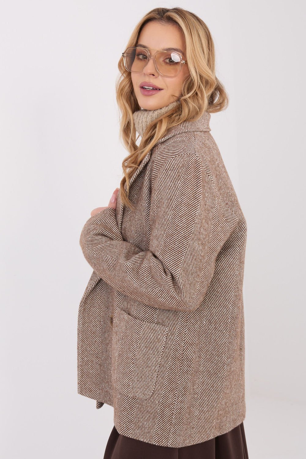 Damska marynarka w casualowym stylu to doskonałe połączenie elegancji i wygody, idealne na co dzień oraz do pracy w sezonie jesień/zima. Model wykonany z wysokiej jakości mieszanki kaszmiru z dodatkiem elastanu, co zapewnia komfort noszenia, miękkość oraz delikatną elastyczność materiału. Marynarka wyróżnia się klasycznym wzorem jodełki, który nadaje całości ponadczasowego charakteru. Standardowa długość, długi rękaw oraz dwurzędowe zapięcie na guziki podkreślają stylowy fason i sprawiają, że model prezentuje się niezwykle elegancko, a jednocześnie swobodnie. Model posiada podszewkę, która zwiększa komfort noszenia, oraz naszyte kieszenie, dodające funkcjonalności i casualowego akcentu. Marynarka jest bez ocieplenia, dzięki czemu świetnie sprawdzi się jako warstwa wierzchnia w chłodniejsze dni lub element stylizacji warstwowych. To uniwersalny wybór, który doskonale uzupełni zarówno klasyczne, jak i bardziej codzienne zestawy.