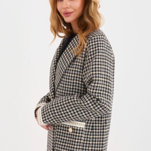 Marynarka tweedowa o eleganckim, klasycznym kroju, wykonana z wysokiej jakości bawełny, idealna na sezon jesień, zima i wiosna. Model o standardowej długości, z długimi rękawami i dwurzędowym zapięciem na guziki. Wykładane klapy, mankiety oraz wsuwane kieszenie ozdobione subtelnymi perełkami, dodającymi marynarce szyku i kobiecego charakteru. Marynarka posiada podszewkę, gładki kraciasty wzór i jest pozbawiona ocieplenia, dzięki czemu sprawdzi się zarówno do codziennych, jak i wizytowych stylizacji, w pracy oraz na eleganckie okazje.