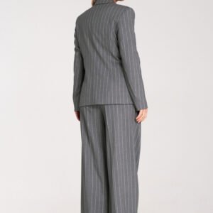 Klasyczna dwurzędowa marynarka o eleganckim fasonie z długimi rękawami. Ramiona wyposażone w poduszki modelujące sylwetkę, nadające marynarce wyraźną strukturę. Z przodu znajdują się wsuwane kieszenie kryte patką, które łączą funkcjonalność z ponadczasowym stylem.