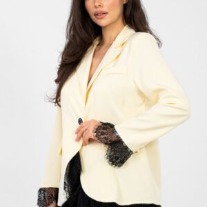 Elegancka marynarka damska o ponadczasowym, klasycznym stylu, idealna na wizytowe okazje, do pracy oraz na imprezę. Gładki fason podkreśla jej uniwersalny charakter, a subtelne detale dodają całości wyjątkowej elegancji. Model został wykonany z wysokiej jakości poliestru z dodatkiem elastanu, co zapewnia trwałość, elastyczność i komfort noszenia. Standardowa długość oraz długi rękaw wykończony delikatną koronką pięknie komponują się z koronkowym wykończeniem u dołu marynarki, nadając jej kobiecego i stylowego wyglądu. Marynarka posiada jednorzędowe zapięcie na guzik oraz podszewkę, która zwiększa wygodę noszenia i sprawia, że całość doskonale układa się na sylwetce. To doskonały wybór dla kobiet, które chcą połączyć klasyczną elegancję z subtelną nutą romantyzmu.