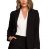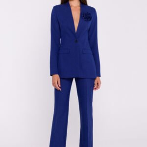Elegancka damska marynarka z tkaniny o taliowanym kroju, podkreślającym sylwetkę. Bez kołnierza, zapinana na jeden guzik, co nadaje jej nowoczesnego i minimalistycznego charakteru. Na piersi znajduje się ozdobny, dopinany kwiatek, który dodaje marynarce unikalnego i kobiecego akcentu. Kieszenie z klapkami wprowadzają praktyczność i styl. Marynarka jest w całości na podszewce, co zapewnia komfort noszenia i doskonałe wykończenie. Zaprojektowana i uszyta w Polsce, to idealny wybór dla kobiet ceniących elegancję z nutą oryginalności.