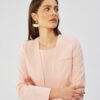 Elegancka damska marynarka uszyta z gładkiej tkaniny o miękkim wykończeniu. Klasyczny kołnierz z ręcznie wykańczanymi klapami podkreśla ponadczasowy charakter modelu. Jednorzędowe zapięcie na guziki oraz mocno taliowany fason, uzyskany dzięki przeszyciom z przodu i z tyłu, pięknie akcentują sylwetkę. Marynarka ma długie, wąskie rękawy i jest w całości na podszewce, co zapewnia komfort oraz nienaganne układanie się materiału. Długość poniżej linii bioder sprawia, że model prezentuje się wyjątkowo szykownie i świetnie komponuje się zarówno ze spodniami garniturowymi, jak i elegancką spódnicą. Ponadczasowy, dopracowany w detalach fason idealnie sprawdzi się w stylizacjach biznesowych i formalnych. Zaprojektowano i uszyto w Polsce.