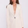 Elegancka damska marynarka uszyta z gładkiej tkaniny o miękkim wykończeniu. Klasyczny kołnierz z ręcznie wykańczanymi klapami podkreśla ponadczasowy charakter modelu. Jednorzędowe zapięcie na guziki oraz mocno taliowany fason, uzyskany dzięki przeszyciom z przodu i z tyłu, pięknie akcentują sylwetkę. Marynarka ma długie, wąskie rękawy i jest w całości na podszewce, co zapewnia komfort oraz nienaganne układanie się materiału. Długość poniżej linii bioder sprawia, że model prezentuje się wyjątkowo szykownie i świetnie komponuje się zarówno ze spodniami garniturowymi, jak i elegancką spódnicą. Ponadczasowy, dopracowany w detalach fason idealnie sprawdzi się w stylizacjach biznesowych i formalnych. Zaprojektowano i uszyto w Polsce.
