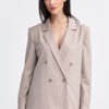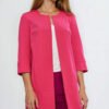 Stylowa marynarka damska o kroju regularnym, z delikatnie luźniejszym fasonem, który zapewnia komfort noszenia i swobodę ruchów. Wykonana z materiału o lnianej fakturze, połączenia rayonu z dodatkiem lnu, łączy w sobie lekkość i przewiewność z eleganckim wyglądem. Model bez zapięcia, z klasycznymi, wykładanymi klapami, co nadaje całości ponadczasowego charakteru. Poduszki na ramionach subtelnie podkreślają sylwetkę, a brak podszewki sprawia, że marynarka jest idealna na cieplejsze dni. Starannie wykończone, lamowane szwy wewnętrzne dodają jakości i estetyki. Doskonale sprawdzi się zarówno w stylizacjach casualowych, jak i bardziej formalnych.