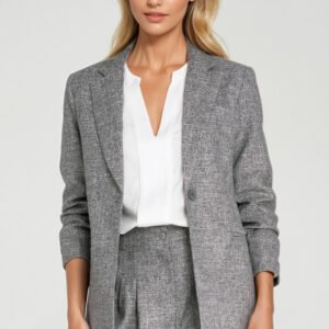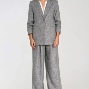 Stylowa marynarka damska o kroju regular, luźnym, wykonana z materiału o melanżowej fakturze i niejednolitym kolorze, który nadaje jej nowoczesnego charakteru. Model posiada wykładane klapy oraz rękawy 3/4 z delikatnymi zakładkami, co dodaje całości lekkości i elegancji. Marynarka jest zapinana na jeden guzik, a z przodu znajdują się imitacje kieszeni. Poduszki na ramionach subtelnie podkreślają linię sylwetki, a pełna podszewka zapewnia komfort noszenia i eleganckie wykończenie. Doskonała zarówno do stylizacji casualowych, jak i bardziej formalnych.