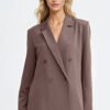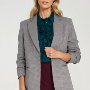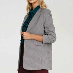 Stylowa marynarka damska o luźnym kroju regular fit, wykonana z materiału o niejednolitym kolorze w drobną pepitkę. Model z klasycznymi, wykładanymi klapami i rękawami 3/4 z subtelnymi zakładkami, które dodają lekkości całej sylwetce. Marynarka zapinana na jeden guzik, z przodu posiada imitacje kieszeni, co podkreśla jej elegancki, minimalistyczny charakter. Dla lepszego układu na sylwetce zastosowano poduszki na ramionach. Całość wykończona podszewką, gwarantującą komfort noszenia i estetyczne wykończenie wnętrza. Idealna propozycja zarówno do stylizacji biznesowych, jak i casualowych doskonale komponuje się z jeansami, cygaretkami lub spódnicą.