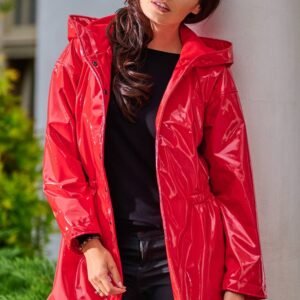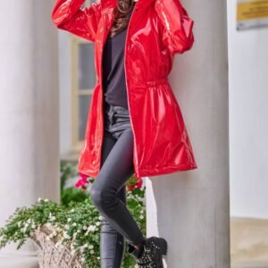 Winylowy płaszcz o długości przed kolano z kapturem i prostymi rękawami. Poszerzany ku dołowi, ze ściągaczem na wysokości talii, zapinany na napy. Sprawdzi się jako płaszcz przeciwdeszczowy. Dostępny w dwóch kolorach: czarnym i czerwonym. Ten płaszcz zaprojektowaliśmy i uszyliśmy w Polsce